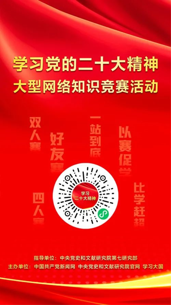 為學(xué)習(xí)宣傳貫徹黨的二十大精神,引導(dǎo)廣大干部群眾深入學(xué)習(xí)黨的二十大報(bào)告和黨章,認(rèn)真領(lǐng)悟黨的二十大提出的新思想新論斷、作出的新部署新要求,推動(dòng)黨的二十大精神廣泛深入為廣大干部群眾所了解和掌握,“學(xué)習(xí)黨的二十大精神”大型網(wǎng)絡(luò)知識(shí)競賽活動(dòng)正式啟動(dòng)。