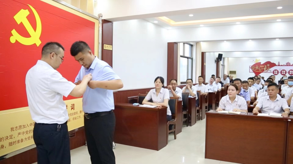 接著,在王高峰同志帶領(lǐng)下,面向鮮紅的中國(guó)共產(chǎn)黨黨旗,新、老黨員舉起右拳、莊嚴(yán)宣誓,鏗鏘有力的誓言響徹會(huì)場(chǎng),短短80個(gè)字的入黨誓詞,震撼著現(xiàn)場(chǎng)每一位黨員。