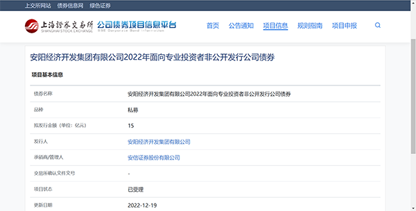 12月16日,集團(tuán)收到上海證券交易所通知,集團(tuán)報(bào)送的非公開發(fā)行公司債券并掛牌轉(zhuǎn)讓的申請(qǐng),上交所按照相關(guān)規(guī)定已予受理。本期債券名稱為安陽(yáng)經(jīng)濟(jì)開發(fā)集團(tuán)有限公司2022年面向?qū)I(yè)投資者非公開發(fā)行公司債券,品種為私募債,金額15億元,承銷商/管理人為安信證券。