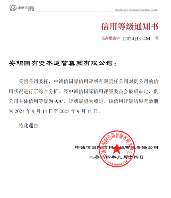 近日,經(jīng)國內(nèi)權(quán)威評(píng)級(jí)機(jī)構(gòu)中誠信國際信用評(píng)級(jí)有限責(zé)任公司(下稱“中誠信國際”)的評(píng)定,安陽國有資本運(yùn)營集團(tuán)有限公司(下稱“安陽國資集團(tuán)”)再次獲AA+主體信用等級(jí),評(píng)級(jí)展望為“穩(wěn)定”。 這是繼2023年4月東方金誠國際信用評(píng)估有限公司評(píng)定安陽國資集團(tuán)AA+主體信用等級(jí)后,國內(nèi)又一家具有較高市場(chǎng)認(rèn)可度的評(píng)級(jí)公司給出的AA+主體信用等級(jí),實(shí)現(xiàn)了國資集團(tuán)“雙AA+評(píng)級(jí)”,進(jìn)一步增強(qiáng)了國資集團(tuán)信用等級(jí)的公信力。