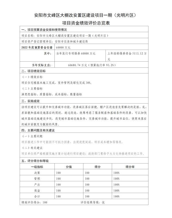 安陽市文峰區(qū)大棚改安置區(qū)建設(shè)項目一期(光明片區(qū))項目資金績效評價報告